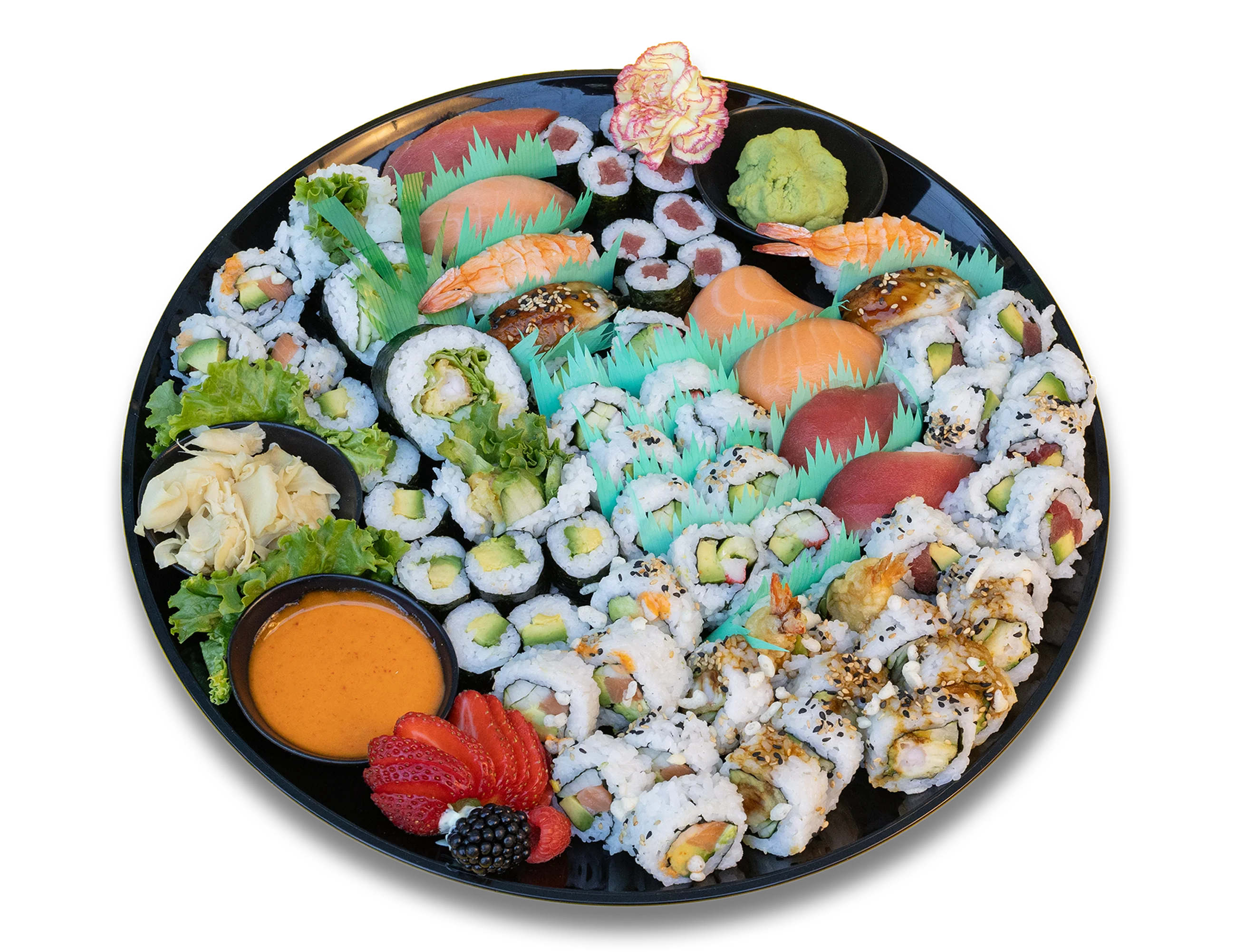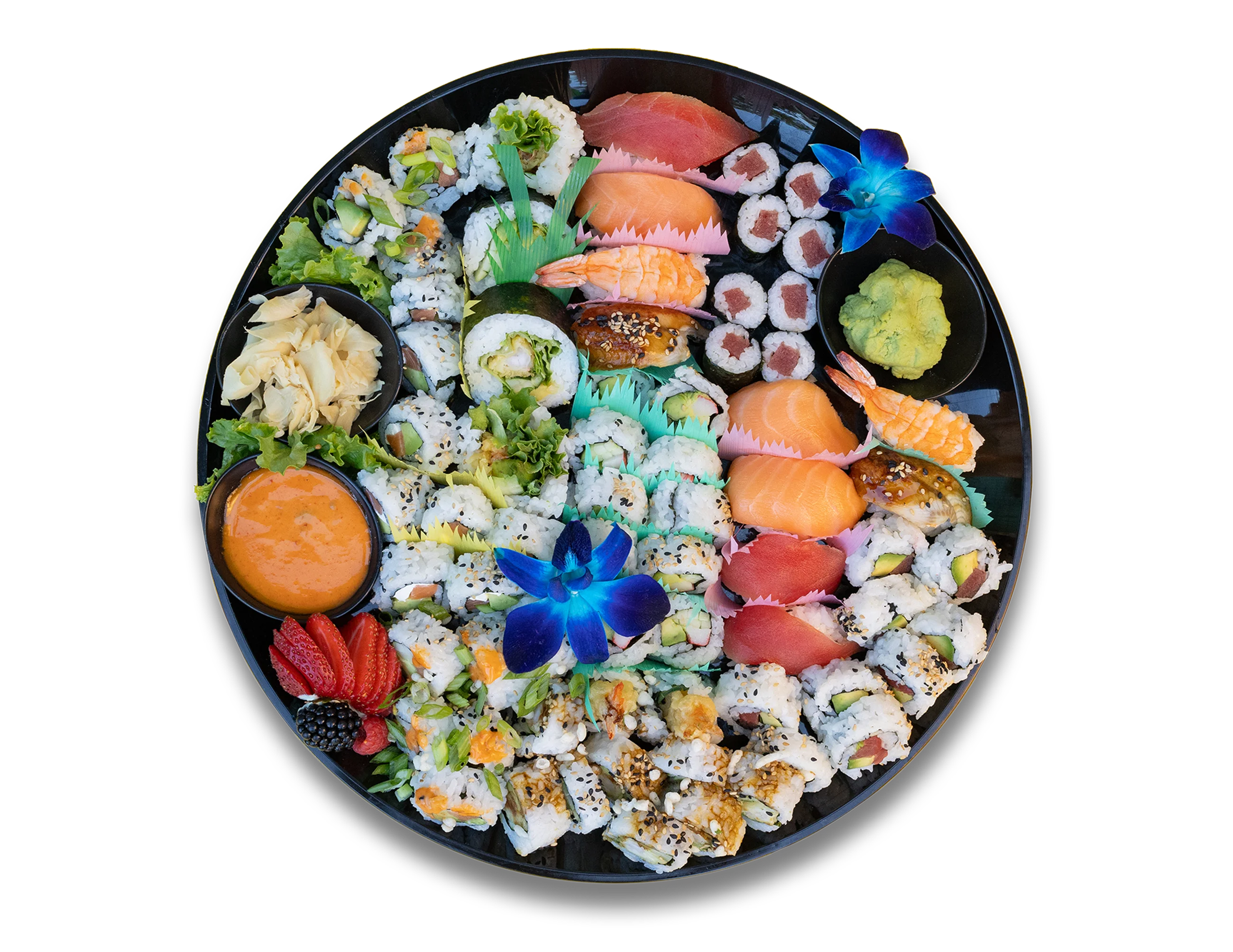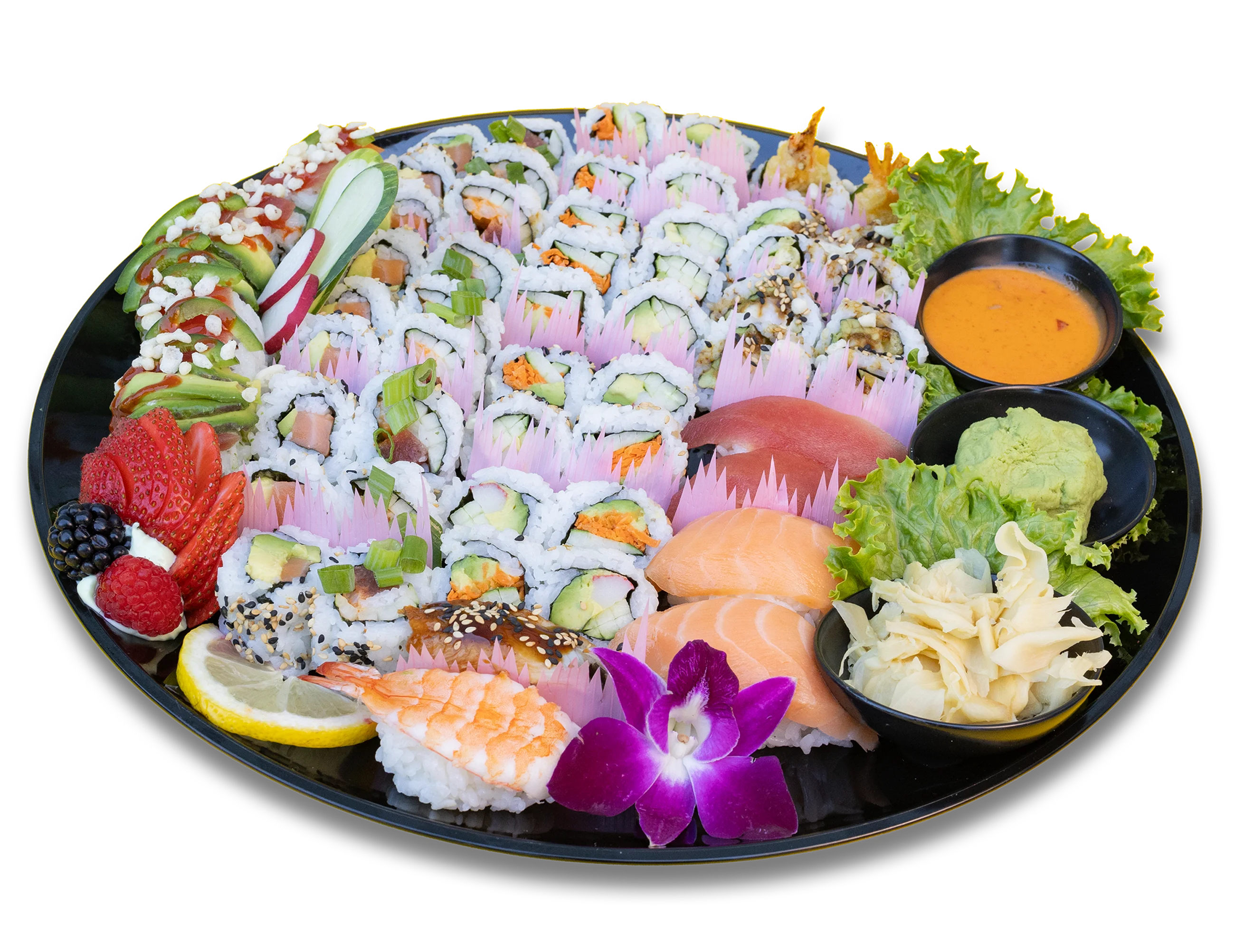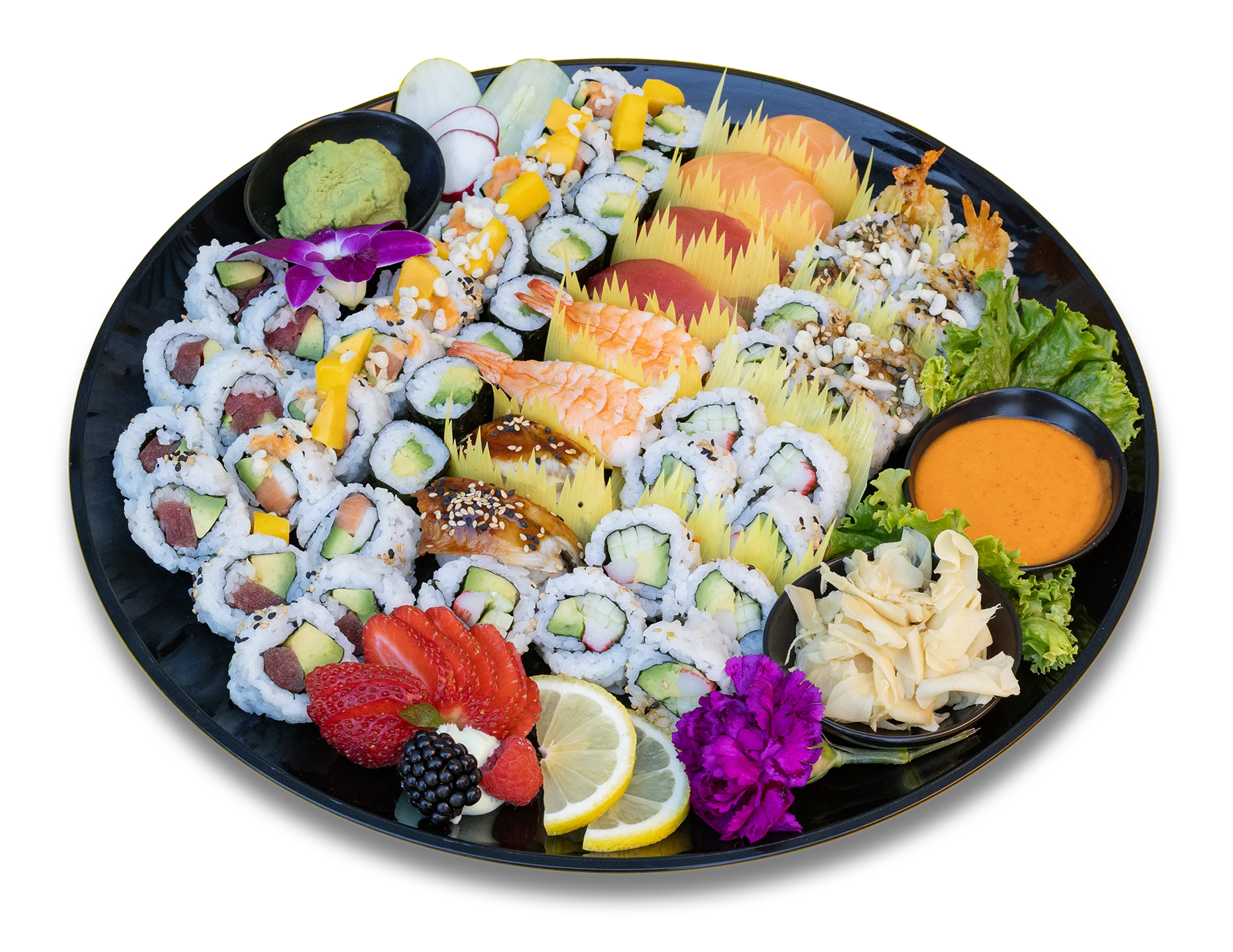 Please allow us 24 hours to prepare your order. Custom orders available. Before placing your order, Please inform sushi chef if a person in your party has a food allergy. Any questions please ask sushi chef for detailed information on platters.