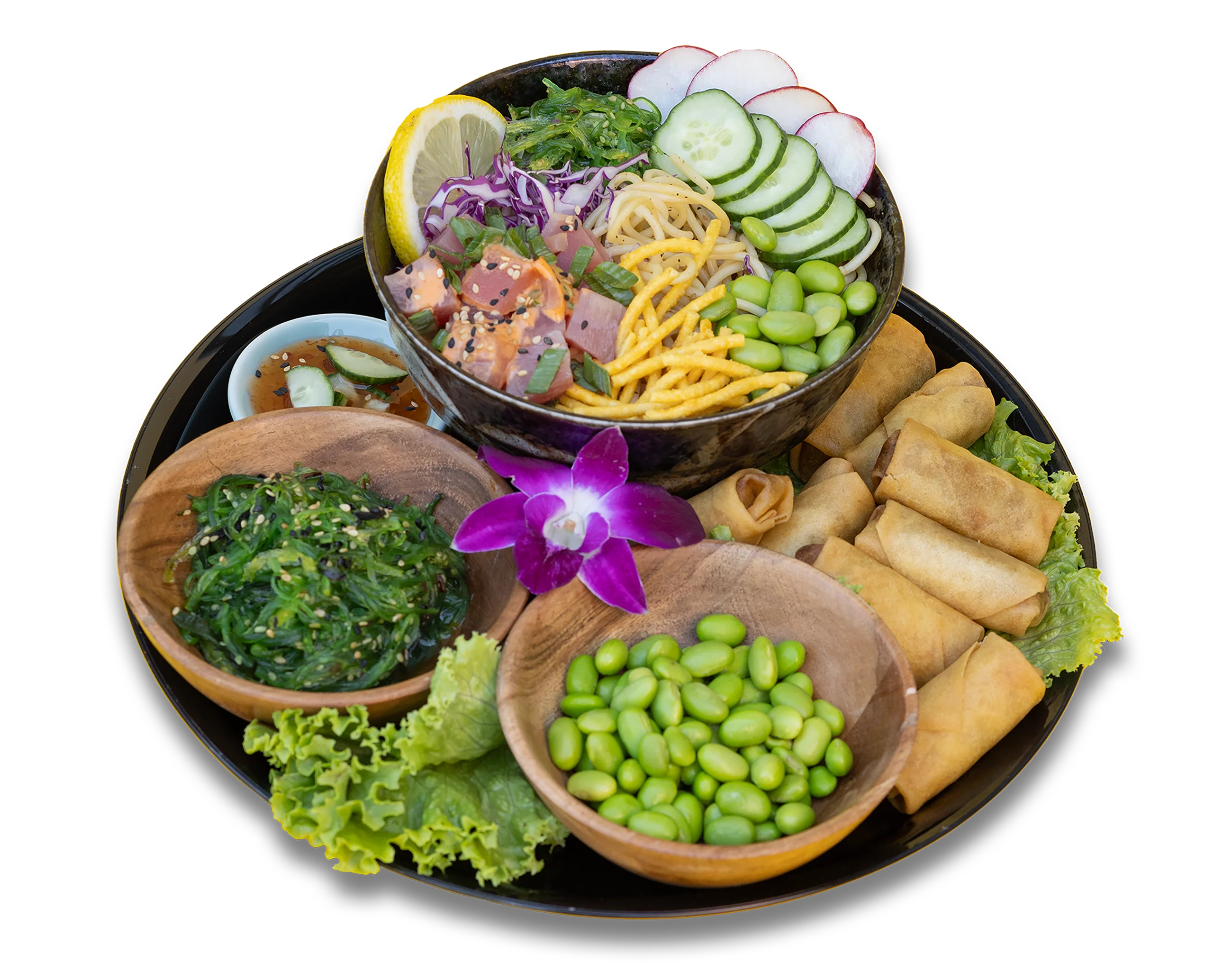 4oz Seaweed Salad 8oz Edamame 8pc Fried Veggie Spring Rolls 1 Bowl Poke Tuna Poke Noodles